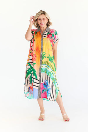 This breezy below-the-knee radiates tropical charm, showcasing bold palm leaves, vibrant florals and a playful splash of pink, yellow, green and blue. The black-and-white polka dot trim adds a cheeky contrast at the collar and button line, giving structure to the carefree silhouette. The dress features a relaxed silhouette that moves with ease, while the vibrant tropical print brings instant energy and colour to your wardrobe.A button-down front offers styling versatility, allowing you to wear it closed as a statement piece or open over swimwear or a tank and shorts for a relaxed resort look. The collared neckline and short sleeves give it a touch of polish, making it just as suitable for beachside brunches as it is for everyday adventures.