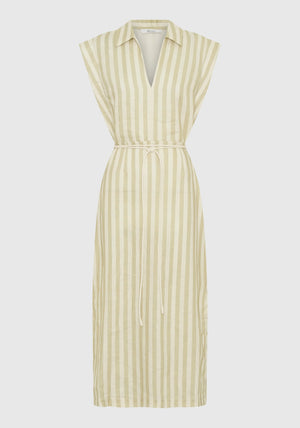 The Cybil Linen Dress is cut from premium linen for effortless wear. It features a classic collar, keyhole neckline, and extended sleeves finished with wide, stitch-detailed cuffs. The straight-cut body and midi-length hem create a streamlined look, finished with side splits and bodice lining for comfort.