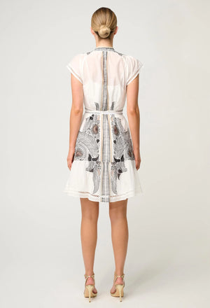 The Ivory Casablanca print is a statement in itself — a hand-drawn pattern inspired by exotic botanicals and architectural motifs, brought to life in timeless neutral tones. Delicate lace trim detailing highlights the flutter sleeves, waist, and hemline, adding a touch of romantic charm to this elevated silhouette.