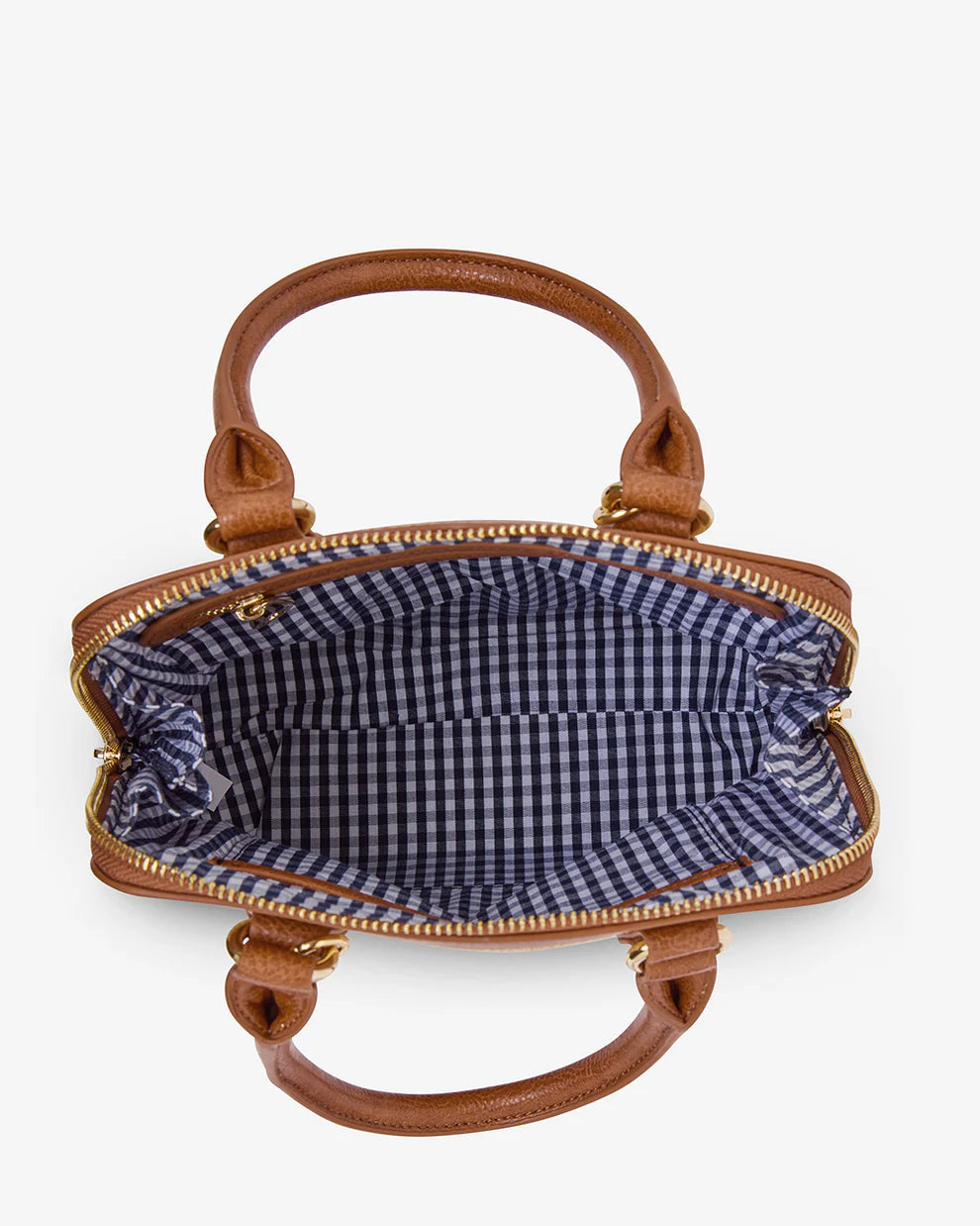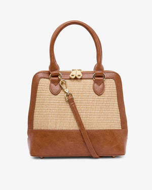 The Elms+King Fairfax Top Grip is made from premium polyurethane and woven poly straw. The handbag offers style and flexibility, featuring classic top grip handles, and 2 removable crossbody strap options. The double head, deep gusset zipper opens to reveal our signature blue & white gingham lining, a zipper pocket with PU trim and an open top slip pocket.