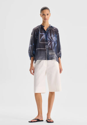 The Antigua Blouse is crafted from a textured semi-sheer linen blend in Morrison’s exclusive print, this blouse features a stand collar, button-front placket, and soft gathers from the neckline. A relaxed fit and ¾ raglan sleeves with elastic cuffs add effortless movement.