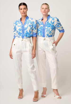 Make a statement with the Calantha Shirt, crafted from lightweight viscose dobby for a soft, breathable feel and subtle texture. Featuring the exclusiveAzure Mosaic print in vibrant blue tones, it’s designed to stand out.Rouched sleeves add structure and flair, while contrast trims at the collar, placket, and cuffs offer a refined finish. Perfect tucked into tailored pants or paired with denim for effortless polish.