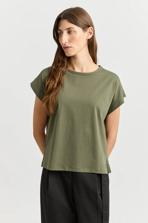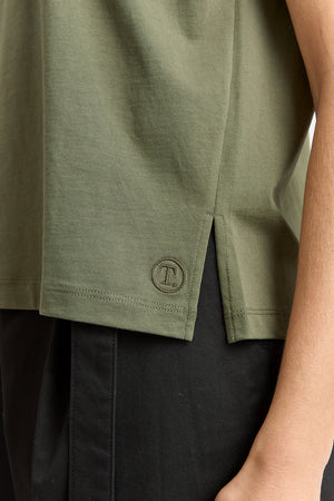 The Crew Neck Tank has a relaxed shape with a round neckline, side splits, and sleeves that extend just beyond the shoulder point. Cut from American grown 100% SUPIMA® Cotton.