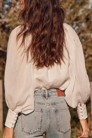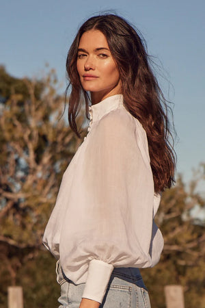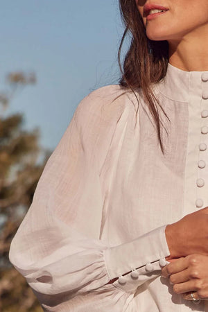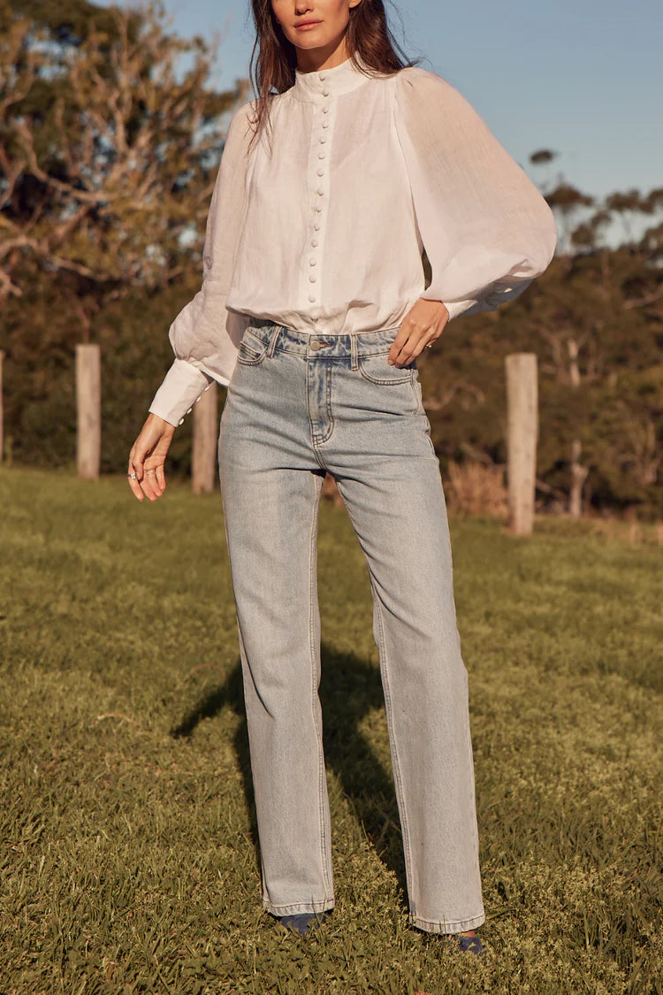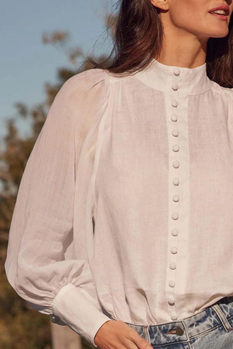 The Atlas Top is a study in structure and fluidity. With a mix of linen and sheer ramie, it balances a more solid looking bodice with airy extravagant sleeves. A high neckline lends a sophisticated iteration of vintage-inspired elegance.