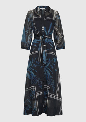 The Antigua Dress showcases Morrison’s exclusive print on a lightweight linen blend. Designed with a collared neckline, concealed button front, and ¾ dolman sleeves, it’s tailored with waist darts and flows into an A-line midi skirt. Finished with a separate slip for coverage.