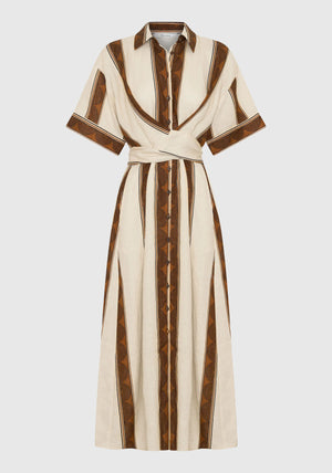 The Harriet Linen Shirt Dress is crafted from premium linen in an exclusive Morrison print. Featuring a traditional collar, elbow length sleeves, and a wrap-around waist tie, this dress offers a flattering, feminine silhouette. Designed with in-seam pockets and a swing midi skirt, it blends ease and refinement for everyday wear.