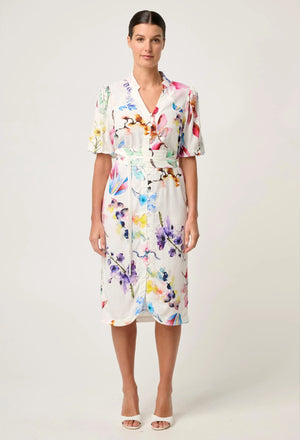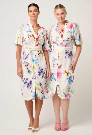 Make a statement with the Gaia Dress, crafted from a breathable linen-viscose blend in the exclusive Plume Blossom print. Featuring delicate lace trims, spliced paneling, and a flattering self-tie waist, this romantic midi moves effortlessly from day to night. A curved hem with front split adds a modern edge—perfect for garden parties, long lunches, or any elegant occasion.