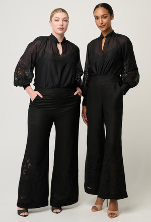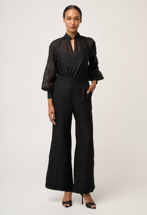 Elegant and timeless, the Simona Cotton Silk Embroidered Blouse in Black is a refined essential designed for elevated everyday and evening wear. Crafted from a luxurious cotton-silk blend, this blouse offers a lightweight, softly sheer finish with a beautiful natural drape. The clean silhouette is elevated by delicate embroidered detailing along the sleeves, adding artisanal texture and subtle sophistication.