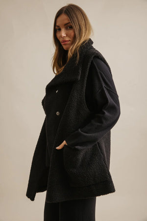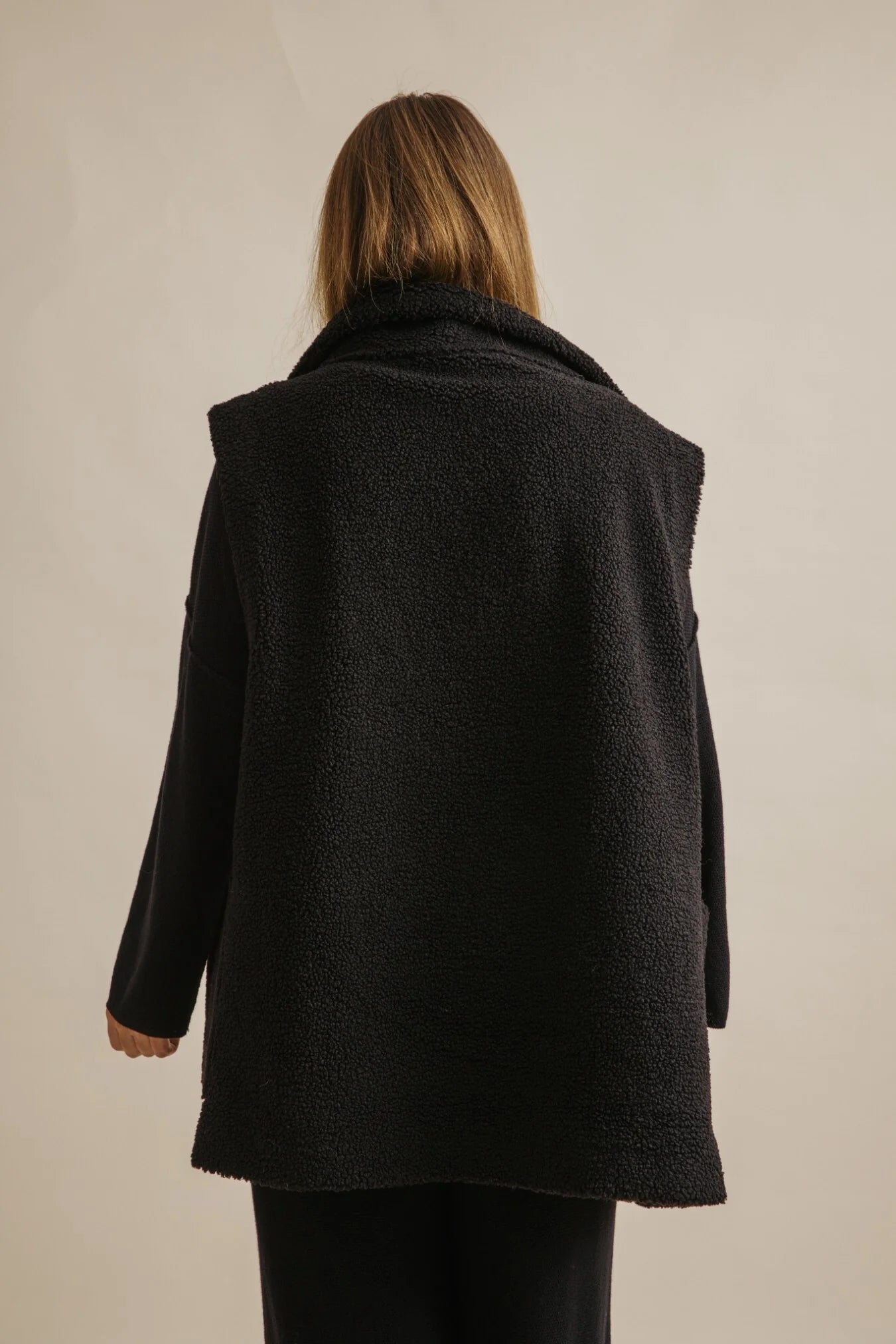 Discover the Sherpa Cuddle Gilet in Noir — your new essential for effortless layering. This longer-line vest combines comfort with style, featuring oversized patch pockets for everyday practicality and a thoughtfully designed dropped underarm that lets your favourite knitwear breathe underneath. The cosy funnel neck collar provides warmth and structure, while snap button fastening keeps things simple and streamlined. Perfect for transitional weather, this versatile gilet works beautifully over long sleeves or as a standalone piece. Built for real life — functional, comfortable, and ready to become your go-to layer all season long.